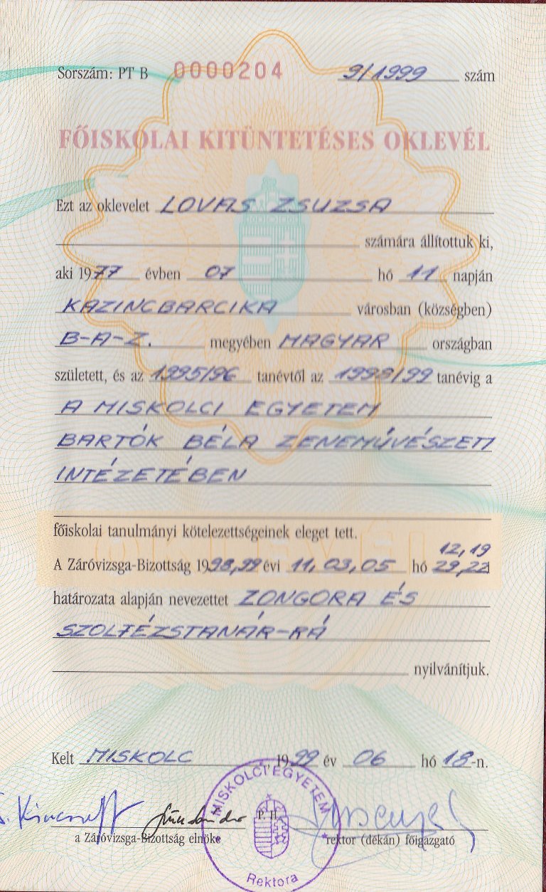 | 1995 - 1999 | Universität Miskolc - Béla Bartók Musikkünstlerisches Institute, Miskolc (Ungarn), Diplom als Lehrerin für Klavier und Musiktheorie |